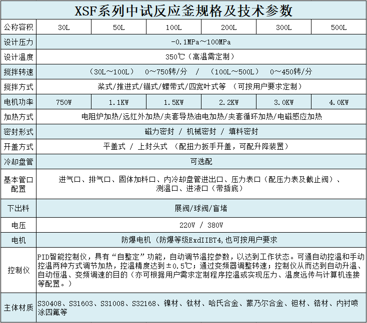 主要材料:釜體材料主要采用0Cr18Ni9(304),00Cr17Ni14Mo2(316L),1Cr18Ni9Ti(321),并可根據(jù)不同介質(zhì)要求制作鈦材(TA2),鎳及鎳合金,鉭材,鋯材,哈氏合金(C-276,C-22,B-2)